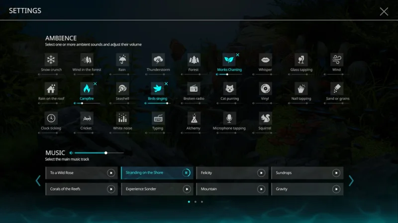 - Возможность создавать индивидуальный звуковой фон из разных эффектов